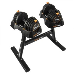 - 2. The adjustment mechanism provides a way to quickly and easily change the desired weight. Especially ideal when you change exercises often, for example changing from 4.5kg bicep curls to 13.5kg bench press, or when you train with drop sets. When the dumbbells are placed in the tray just pull on the adjusting pin and move it the weight you want. Here comes the next ingenious feature in carrying the weight: Weights not needed stay in the tray and the dumbbell minimises in size. This produces a better balance and makes some excercises more comfortable in execution.